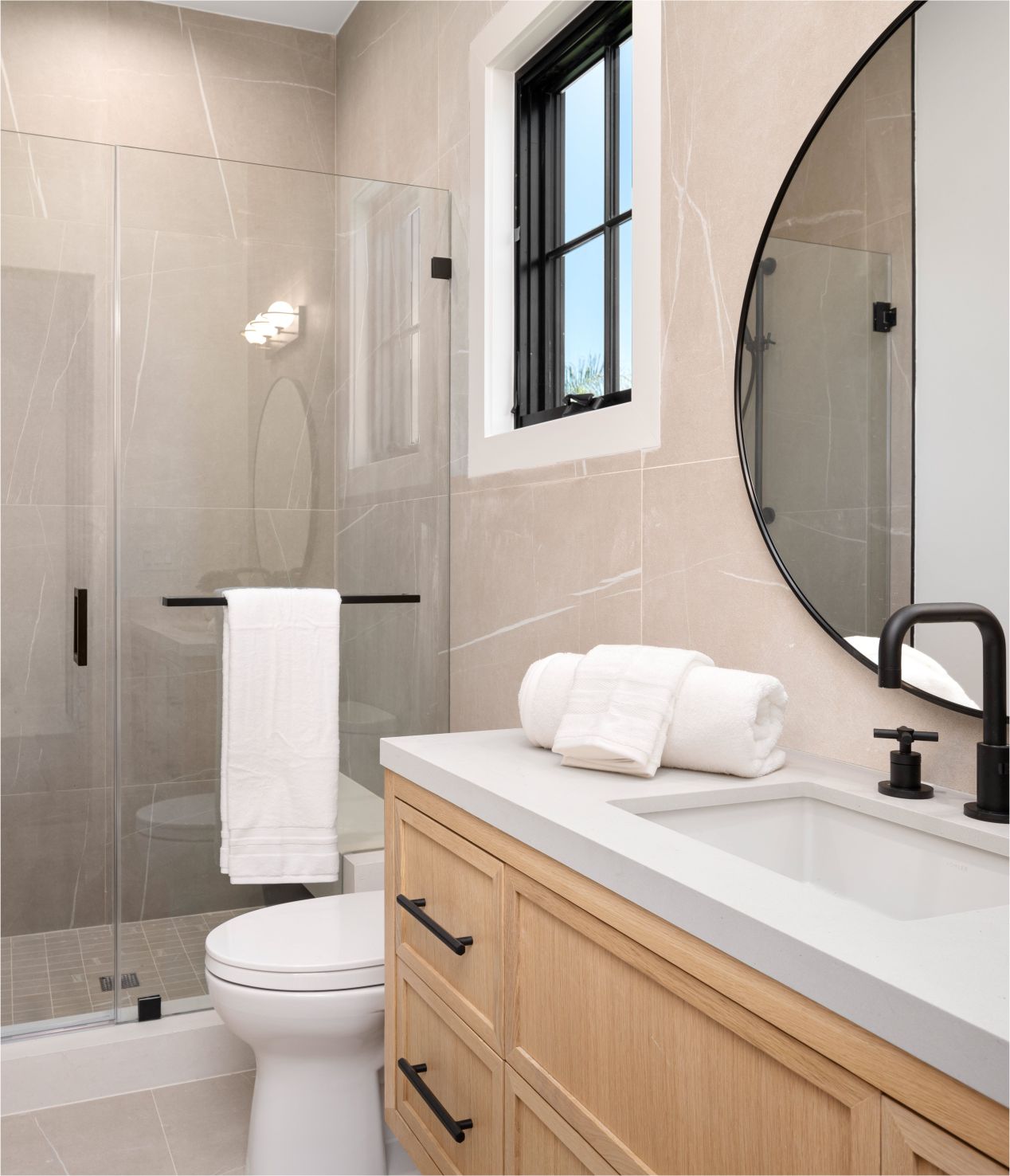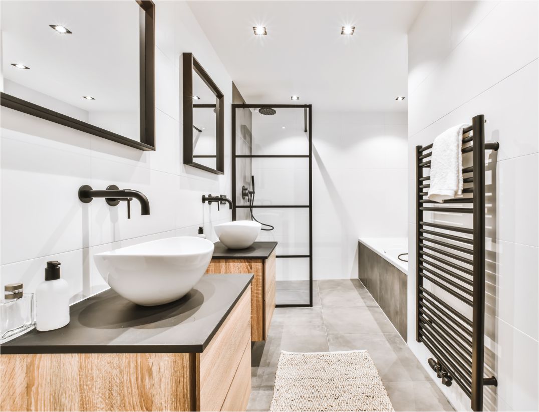 Transformamos la rutina en una experiencia tipo spa con grifería de alta gama y revestimientos minimalistas.