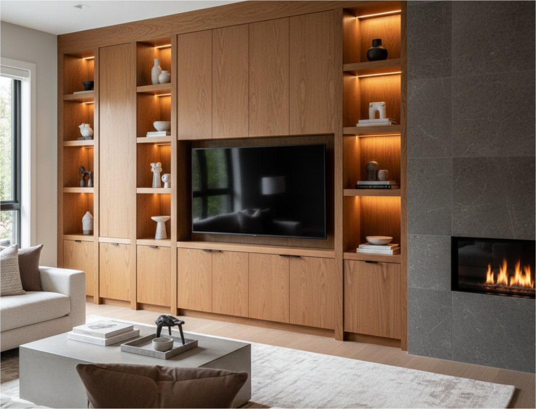Paredes de acento personalizadas y centros de entretenimiento donde el diseño se une con la artesanía de alta ebanistería.