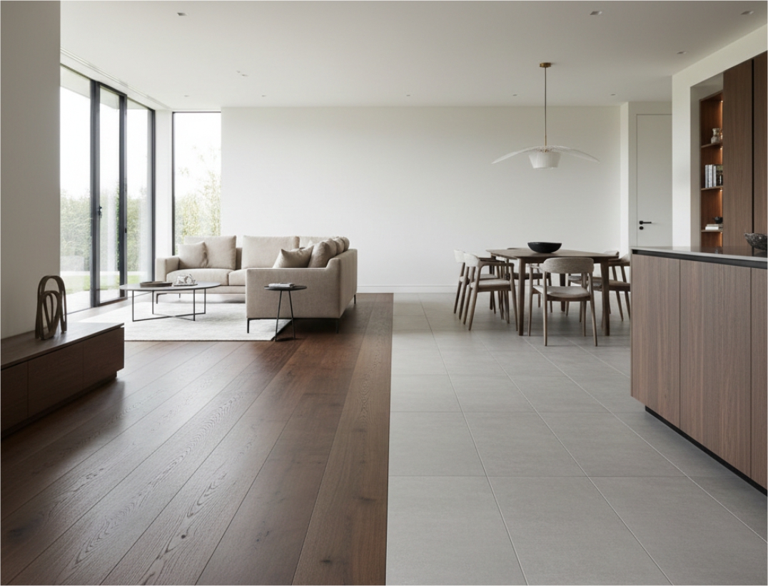 Instalación de precisión de maderas nobles de lujo y baldosas de gran formato para dar solidez al diseño de su hogar.