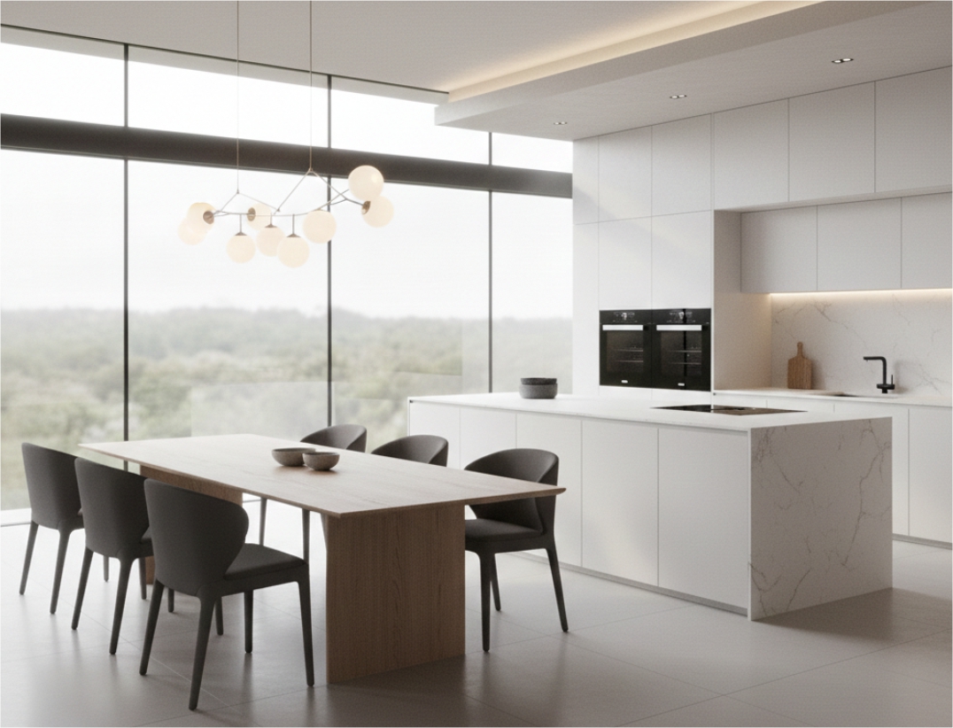 Espacios culinarios gourmet que combinan la eficiencia escandinava con la estética del Moderno de Lujo y acabados premium.